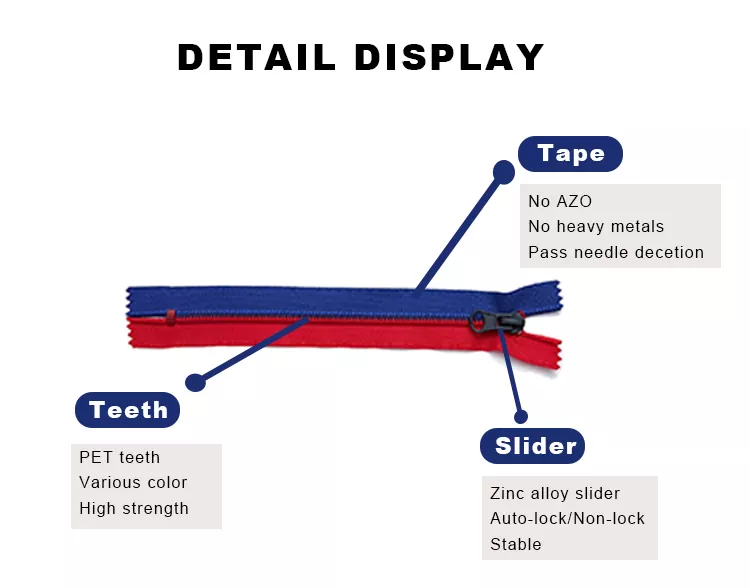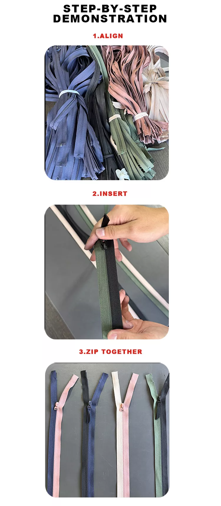 3. আমাদের সমস্ত জিপার রঙ, দৈর্ঘ্য বা উৎপাদন ব্যাচ নির্বিশেষে নির্বিঘ্নে সংযোগ করতে পারে।