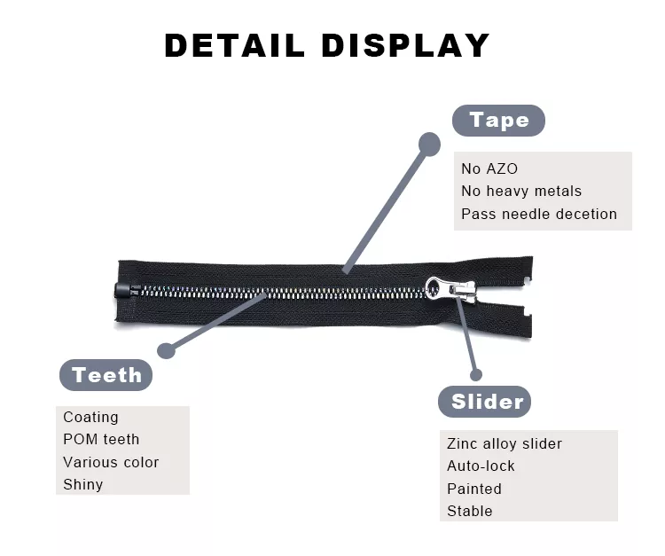TRC প্লাস্টিকের প্রলিপ্ত জিপারে একটি বিশেষ পৃষ্ঠের আবরণ রয়েছে যা প্রচলিত রজন-দাঁতযুক্ত চেইন কাঠামোতে প্রয়োগ করা হয়েছে, যা দাঁতগুলিকে মসৃণ এবং আরও শক্তভাবে প্যাক করে। এটি উল্লেখযোগ্যভাবে পণ্যের মসৃণতা এবং পরিধান প্রতিরোধ ক্ষমতা বাড়ায়। একই সাথে, আবরণ স্তরটি কার্যকরভাবে দাঁতের জারণ প্রতিরোধ ক্ষমতা এবং আর্দ্রতা সুরক্ষা বাড়ায়, যখন চেহারাকে একটি স্বতন্ত্র দীপ্তি প্রদান করে, কার্যকারিতাকে নান্দনিক আবেদনের সাথে একত্রিত করে।