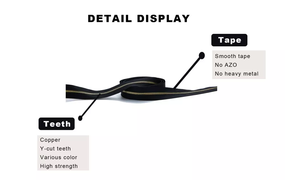 TRC স্ট্যান্ডার্ড ধাতব জিপারগুলি অসাধারণ শক্তি, ঘর্ষণ প্রতিরোধ এবং স্থায়িত্বের জন্য উচ্চ মানের পিতল বা নিকেল দাঁত দিয়ে তৈরি করা হয়। তারা ঘন ঘন ব্যবহার, ধোয়া, এবং উচ্চ-তাপমাত্রা ইস্ত্রি সহ্য করে, মসৃণ অপারেশন এবং বর্ধিত পরিধানের পরেও একটি পরিমার্জিত চেহারা বজায় রাখে।